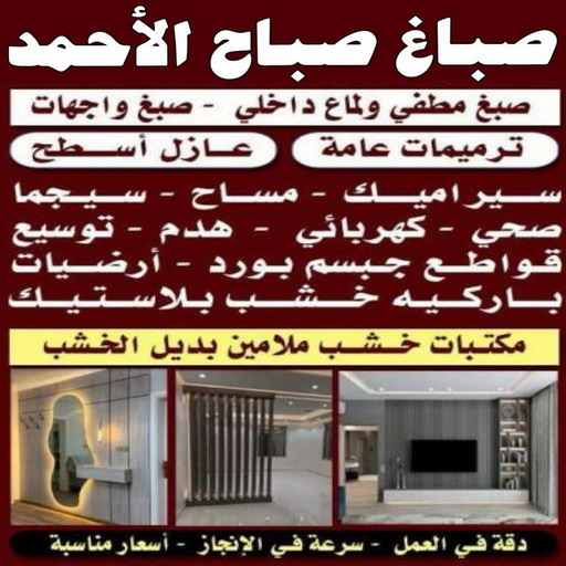 - صباغ صباح الاحمد – صبغ مطفي وصبغ لماع وورق جدران لدينا جميع انواع الاصباغ الحديثة صبغ ايطالي – صدفي – دريم – تعتيق ايضا ترخيم صبغ واجهات وجبسم بورد وترميمات عامة سيراميك اسعارنا بما يرضي الله والجميع